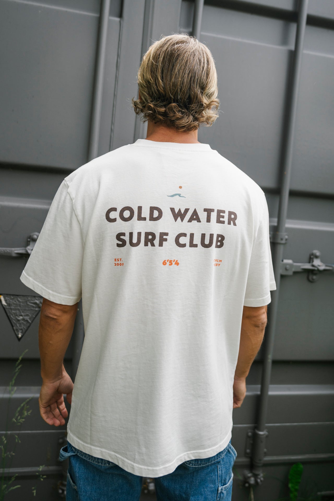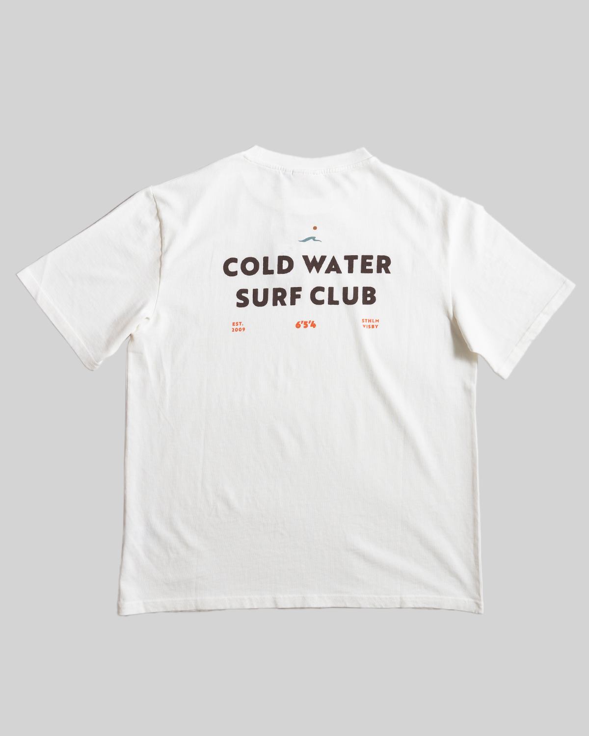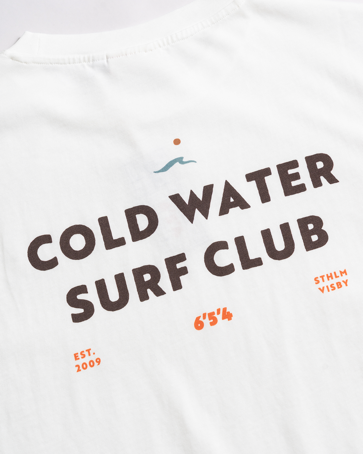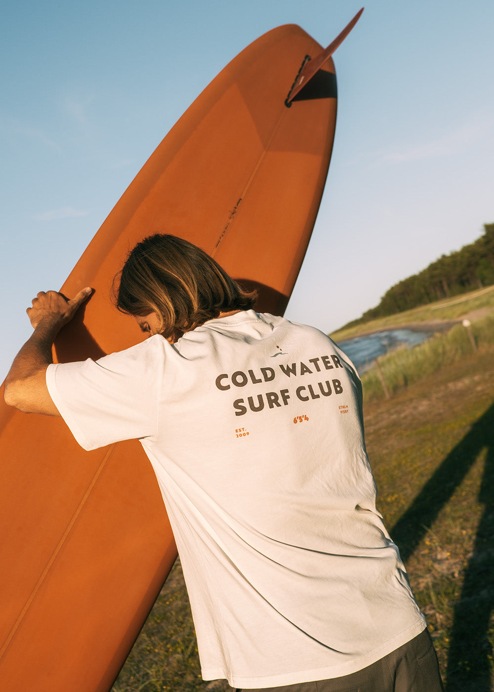 Cold Water Surf Club. This unisex t-shirt from 6/5/4 Supply is made from 100% 230GSM cotton with a soft yet durable quality that lasts wash after wash. With a slightly oversized fit, discreet logo on the front and a larger print on the back, it's a t-shirt with a stylish design and roots in cold water surfing - perfect for both the beach, the city and everyday life.