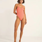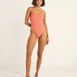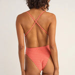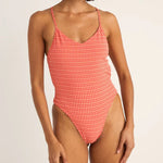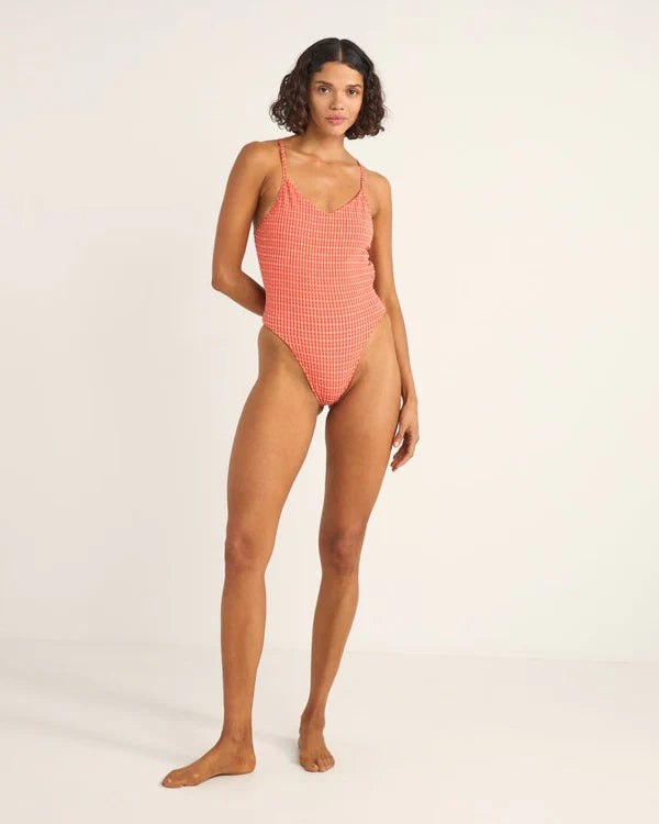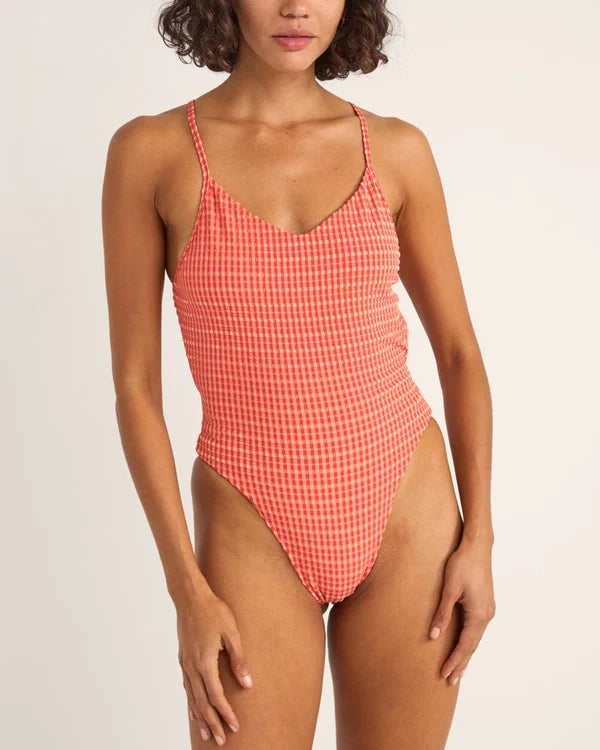 Lola Check One Piece from Rhythm, comes in a red checkered color and has a seersucker texture.