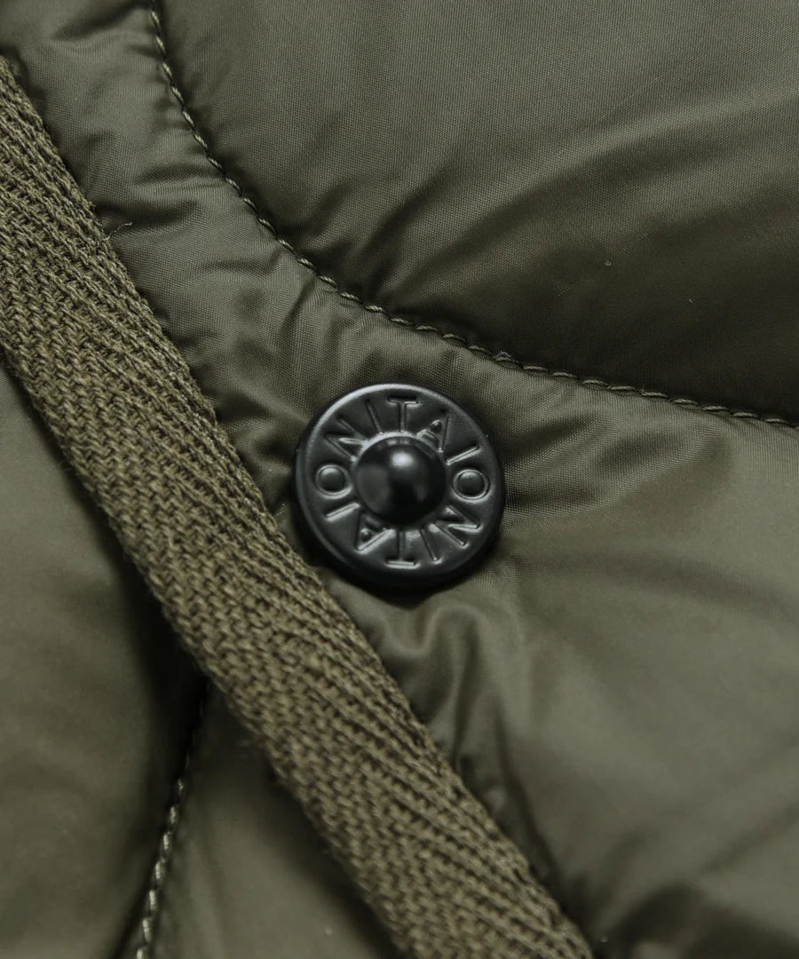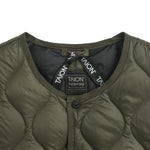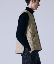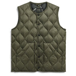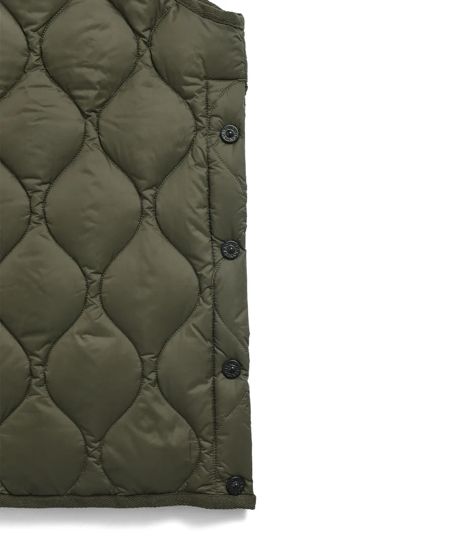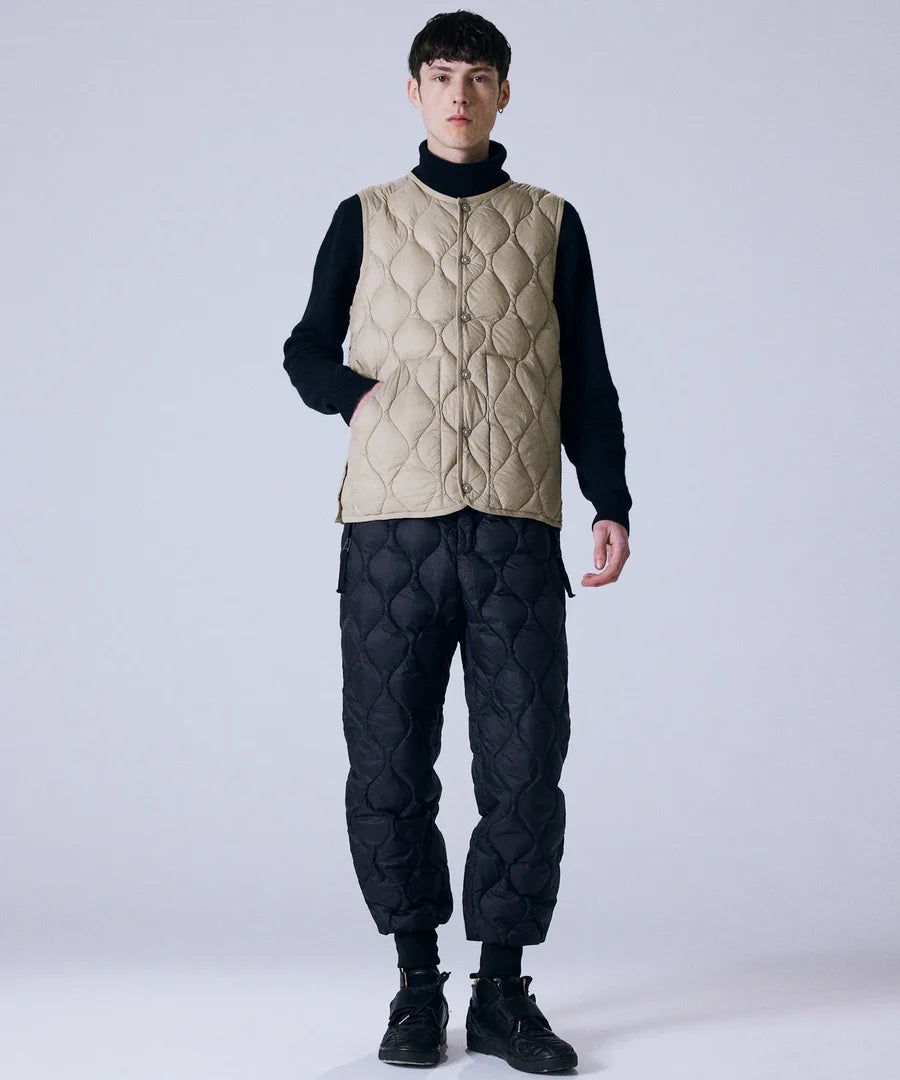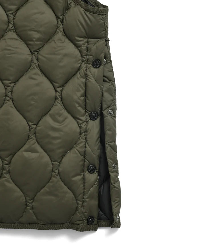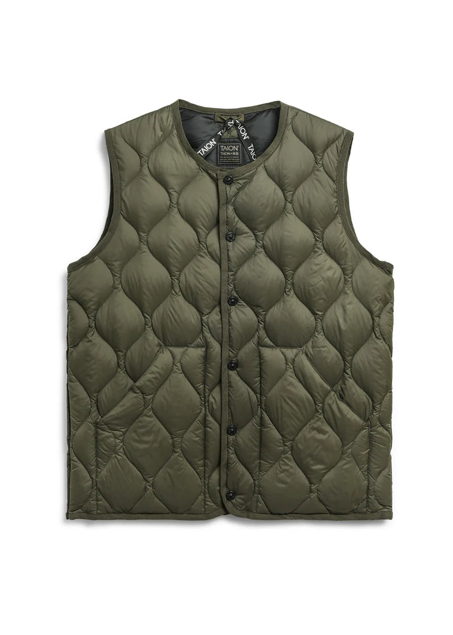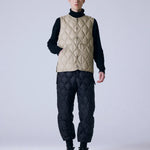 Military Crew Neck Down Vest från Japanska Taion, perfekt lättviktsväst att bära lager på lager eller utanför tröjan för en avslappnad casual look.