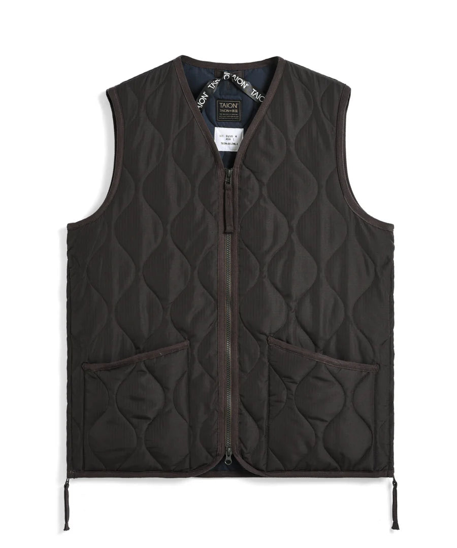 Military Zip V-Neck Down Vest från Japanska Taion är en varm och tålig väst med ett ytterskal i ripstop och är fodrad med dun.