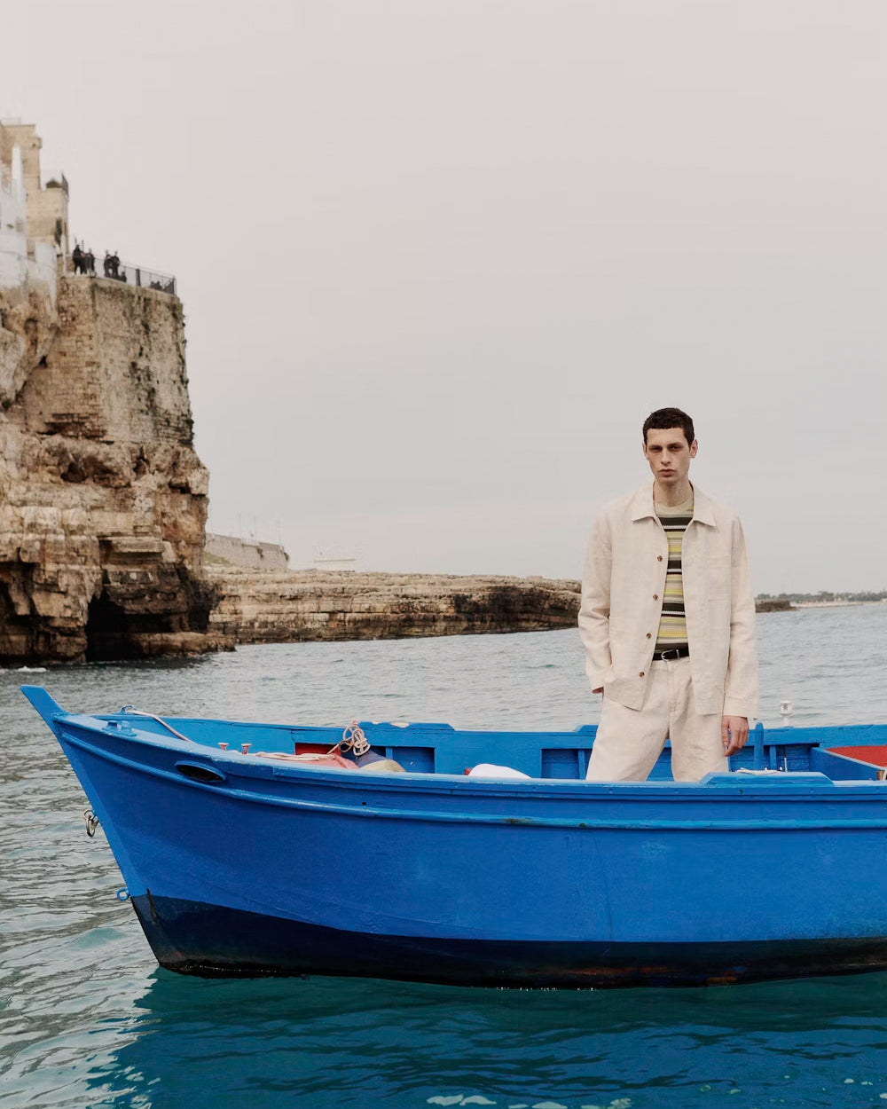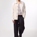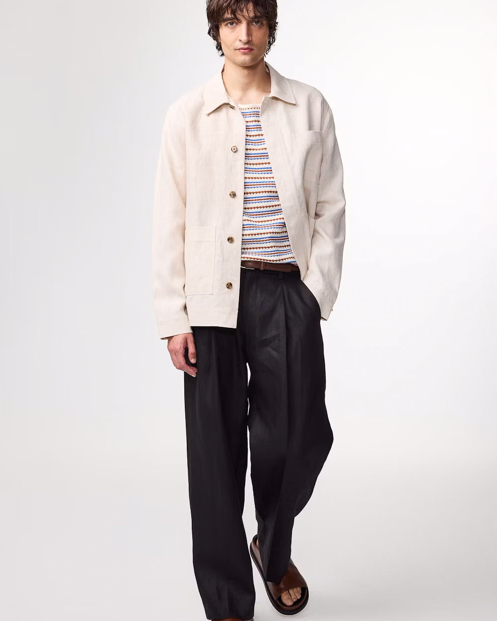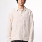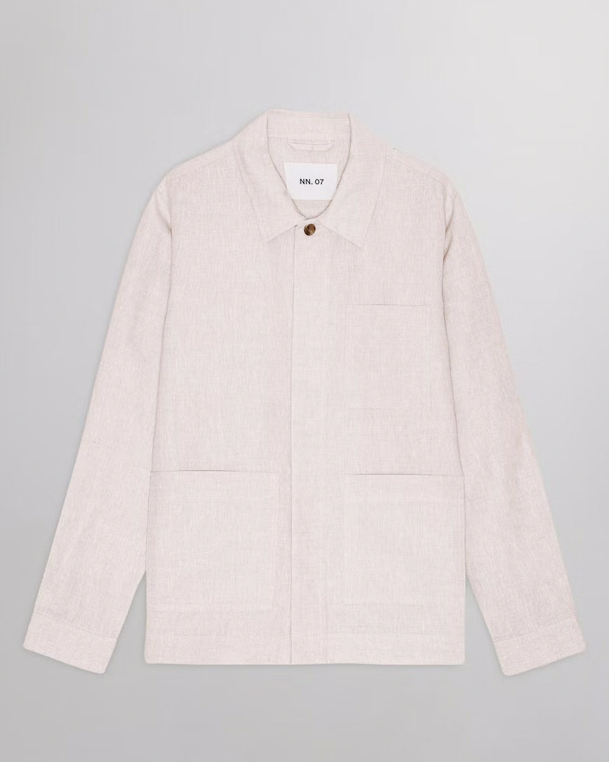 Olav 1454 from NN07 is an unlined work-inspired overshirt made of European linen, designed with a soft collar, a chest pocket and double patch pockets at the waist and hidden buttons.