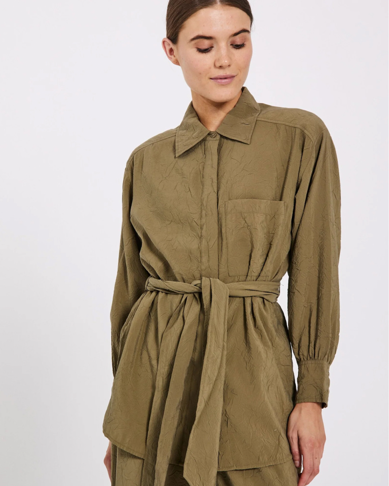 Moa is a long-sleeved shirt from Norr, which is made with a blend of eco viscose and polyester, ties at the waist and features a chest pocket.