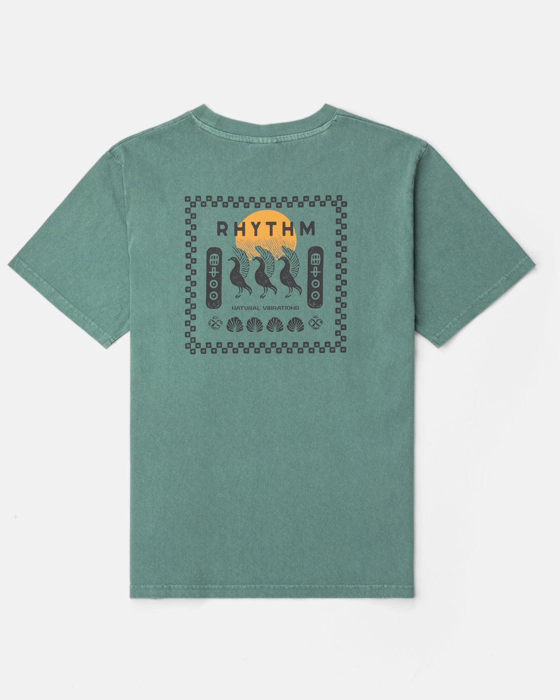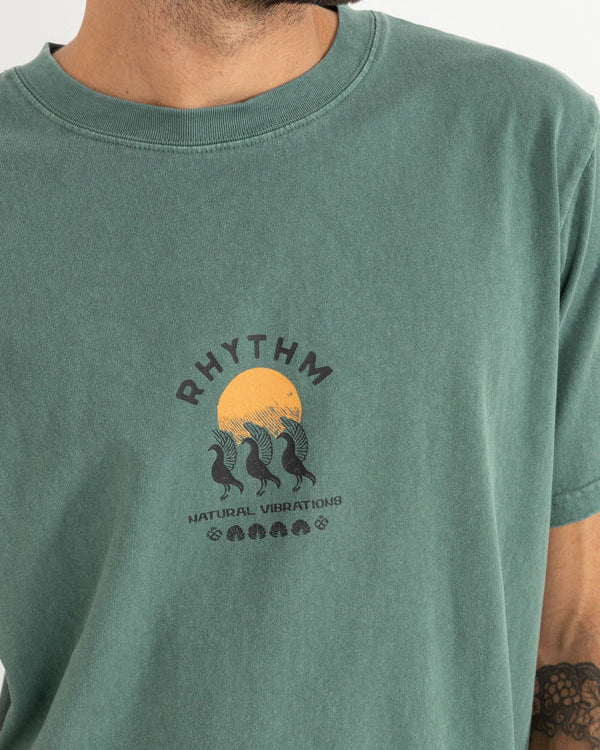 Natural Vibr Vintage T-shirt från Rhythm, tvättad och blekt för en vintage look och känsla, tillverkad i 100% bomull och pryds med screentryck fram och baktill.