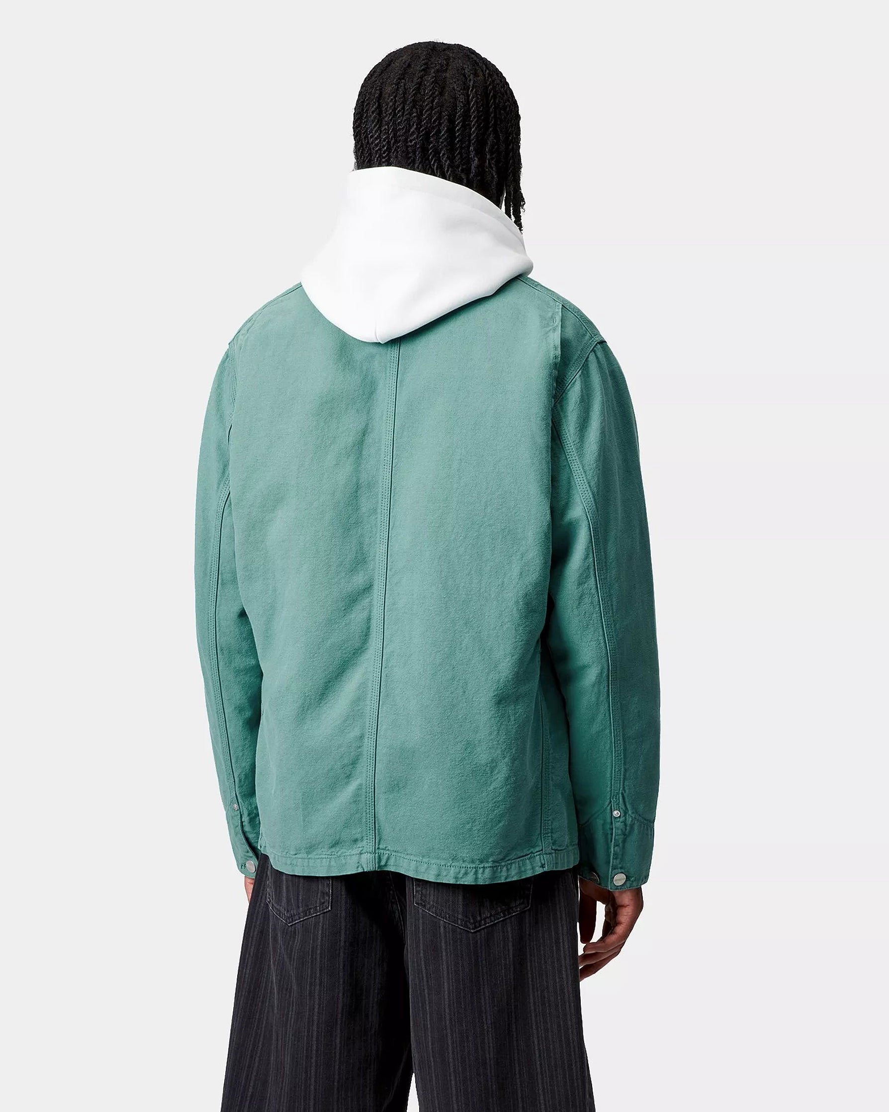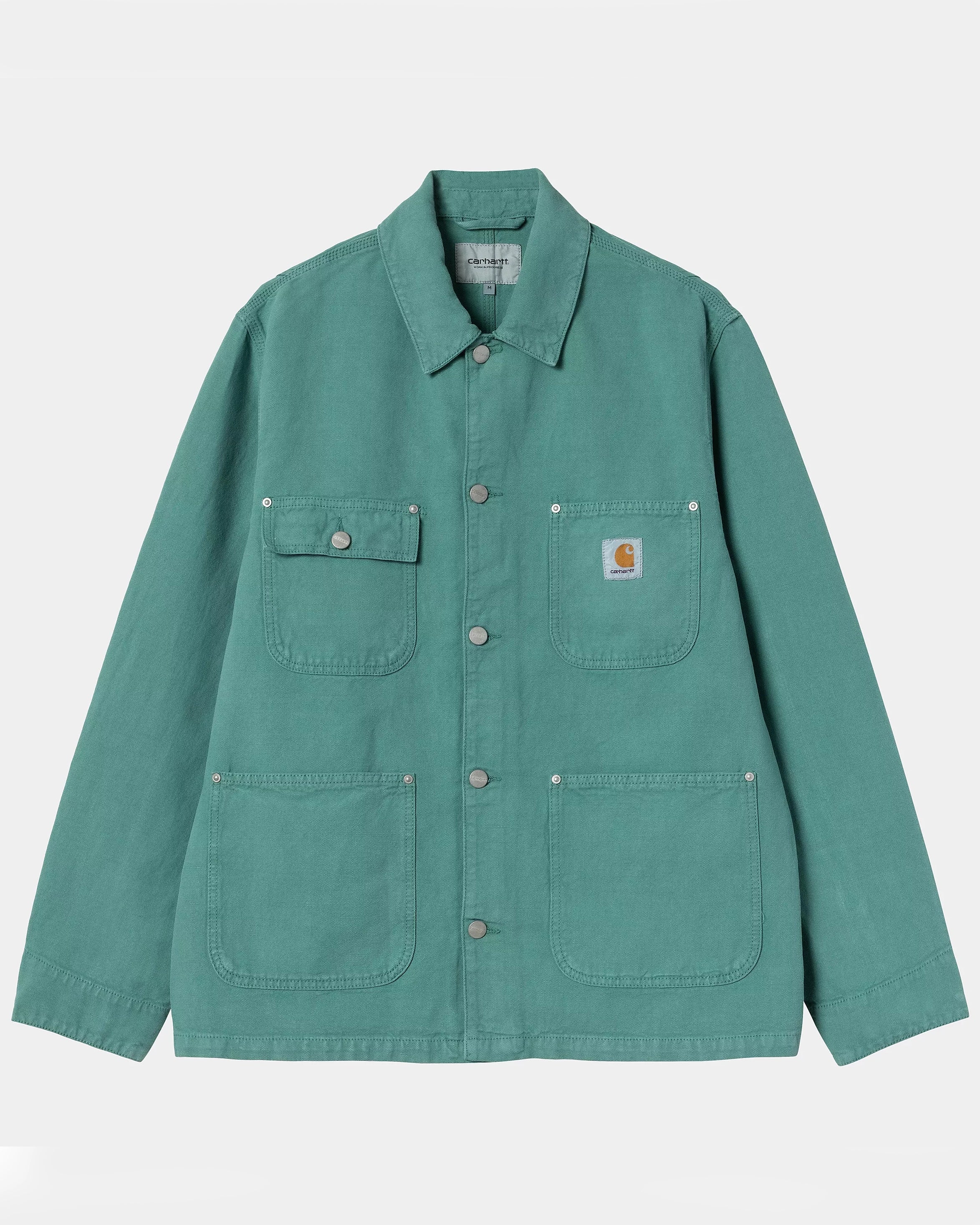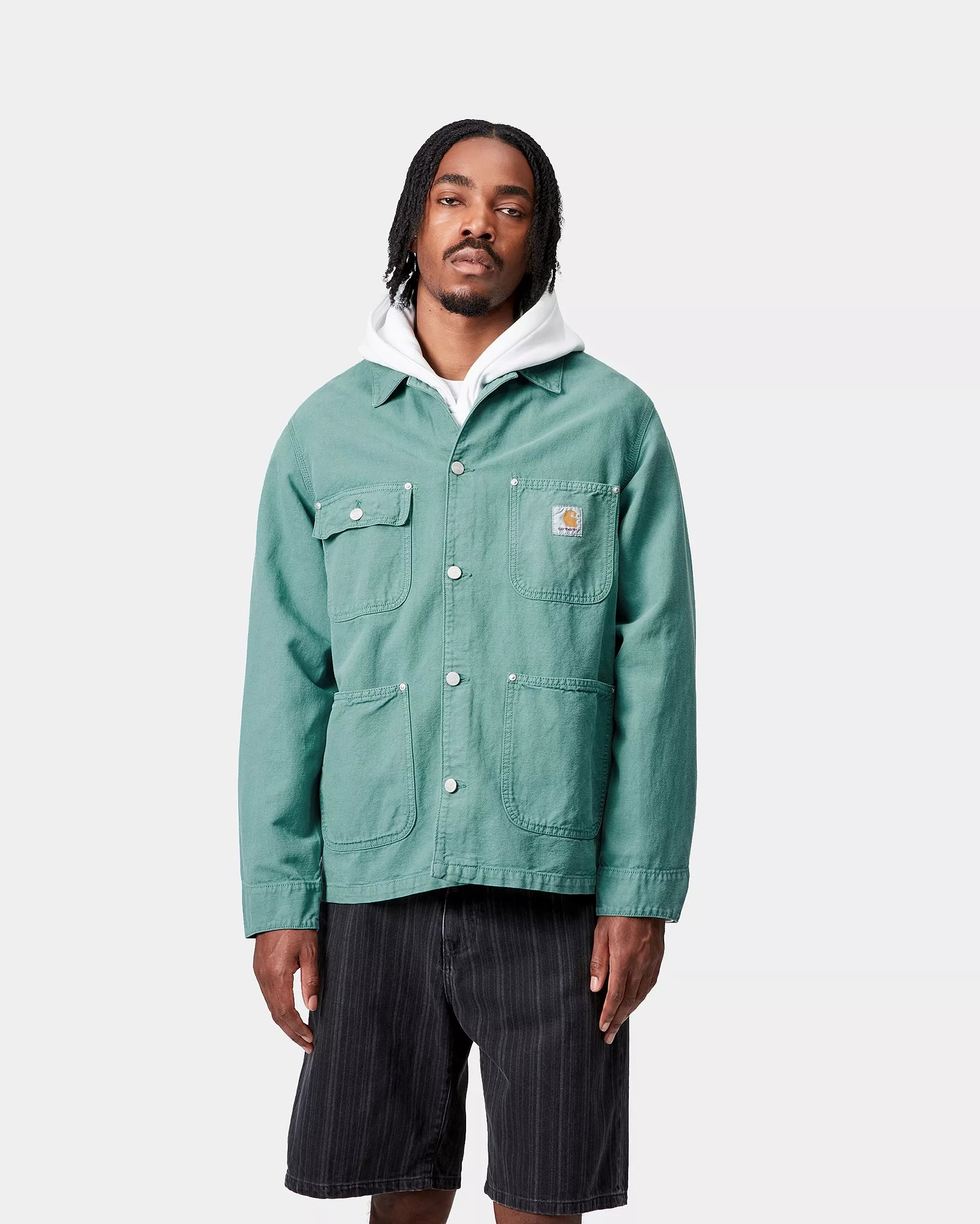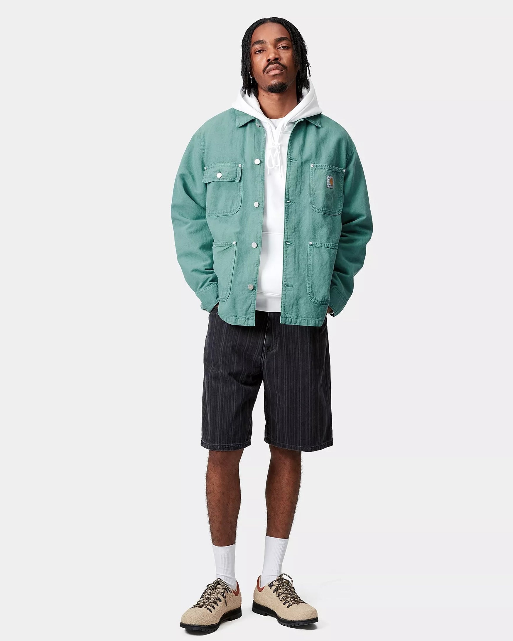 Walter Chore Coat from Carhartt WIP, an unlined jacket in a mix of linen and cotton, garment dyed for a washed look and adorned with patch pockets.