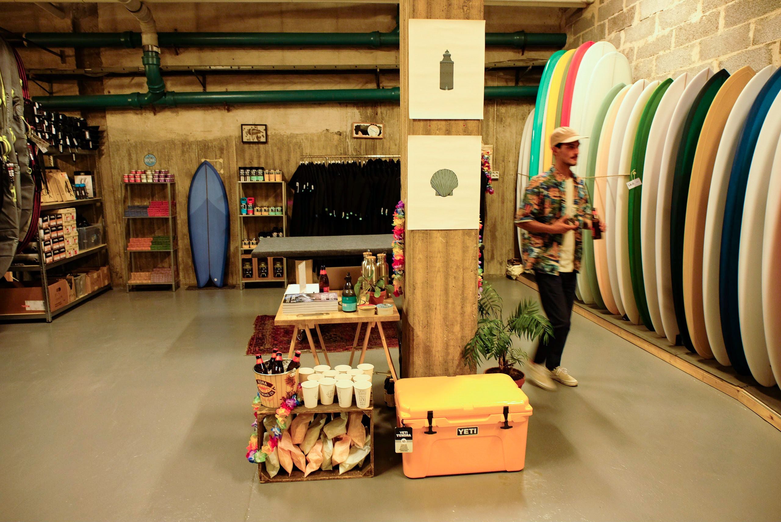 Runt hörnet, bredvid vår fina lokal på Södermalm i Stockholm, har vi installerat Surfgaraget. En fet betonglokal med högt till tak, en bokstavlig undergroundupplevelse dedikerad till surf. Detta garage är vårt showroom, vår konsthall där vi ställer ut våra finaste tavlor. I surfgaraget hittar ni alla brädor i vårt breda sortiment som omöjligen skulle få plats i butiken.