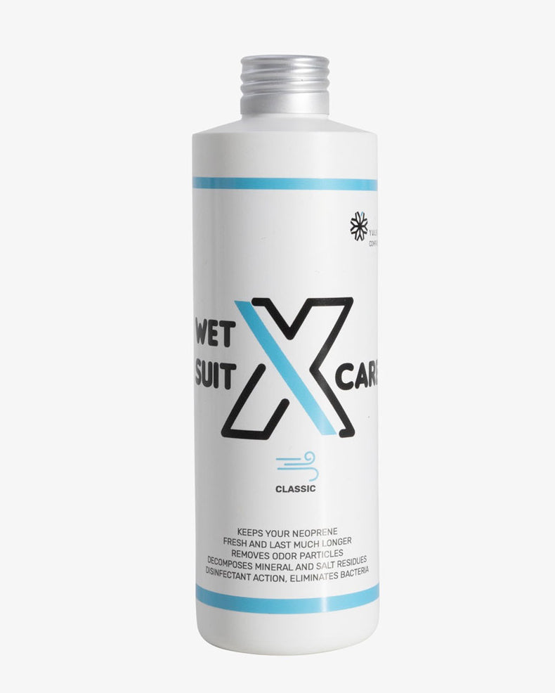 Rengör din våtdräkt med Wetsuit X-Care, ett rengörings- och tvättmedel för våtdräkter och neoprenutrustning.