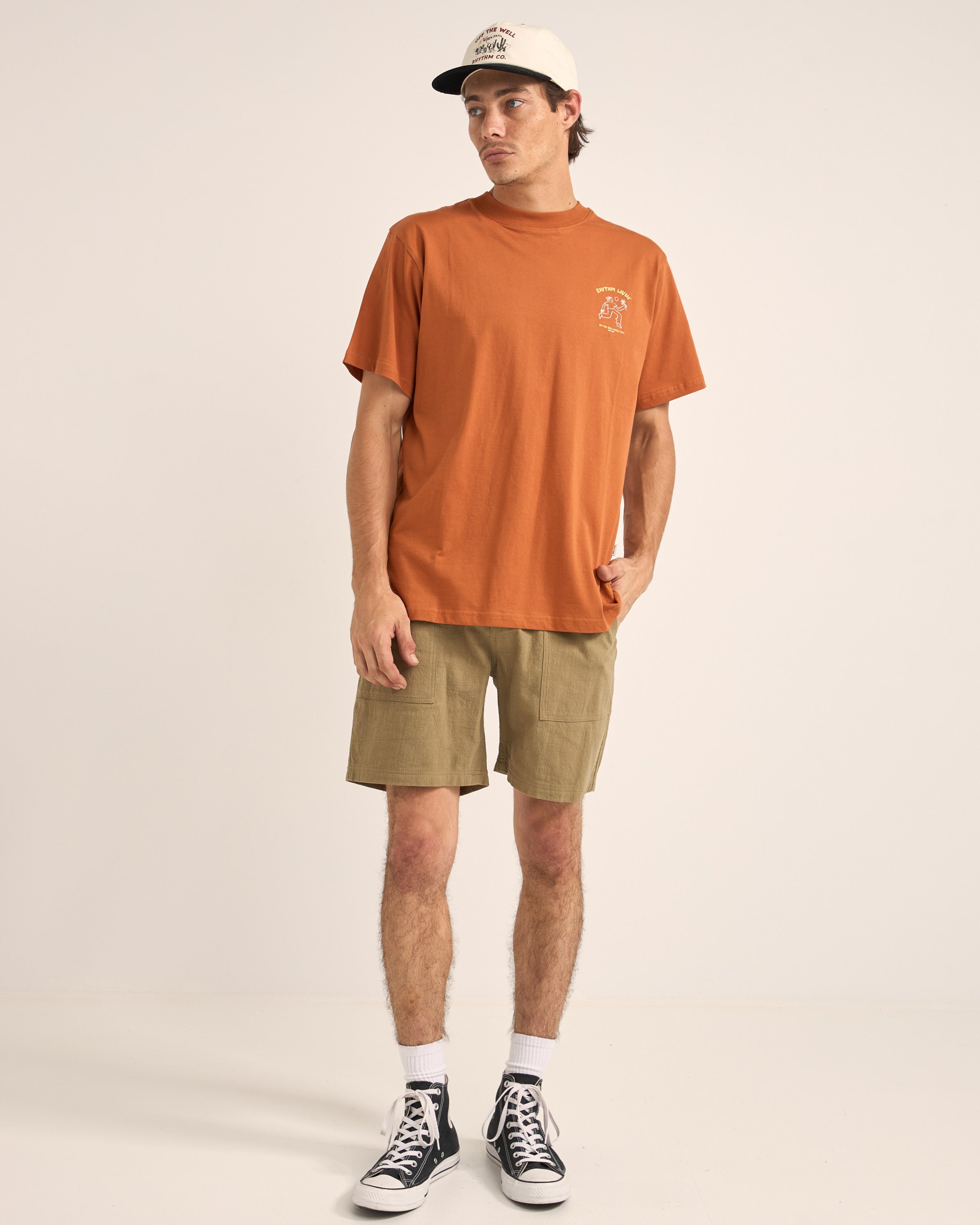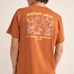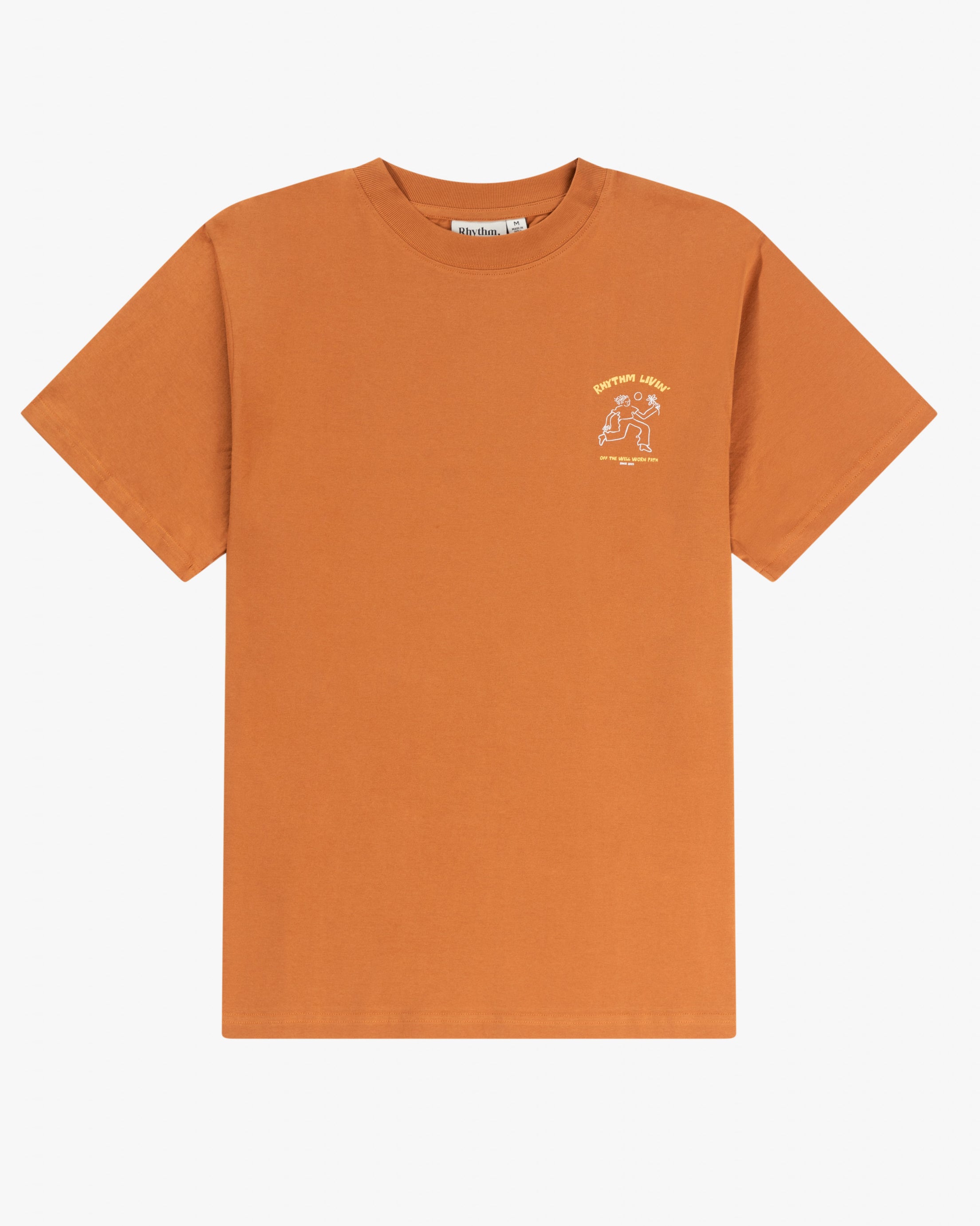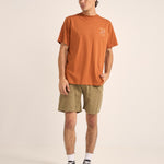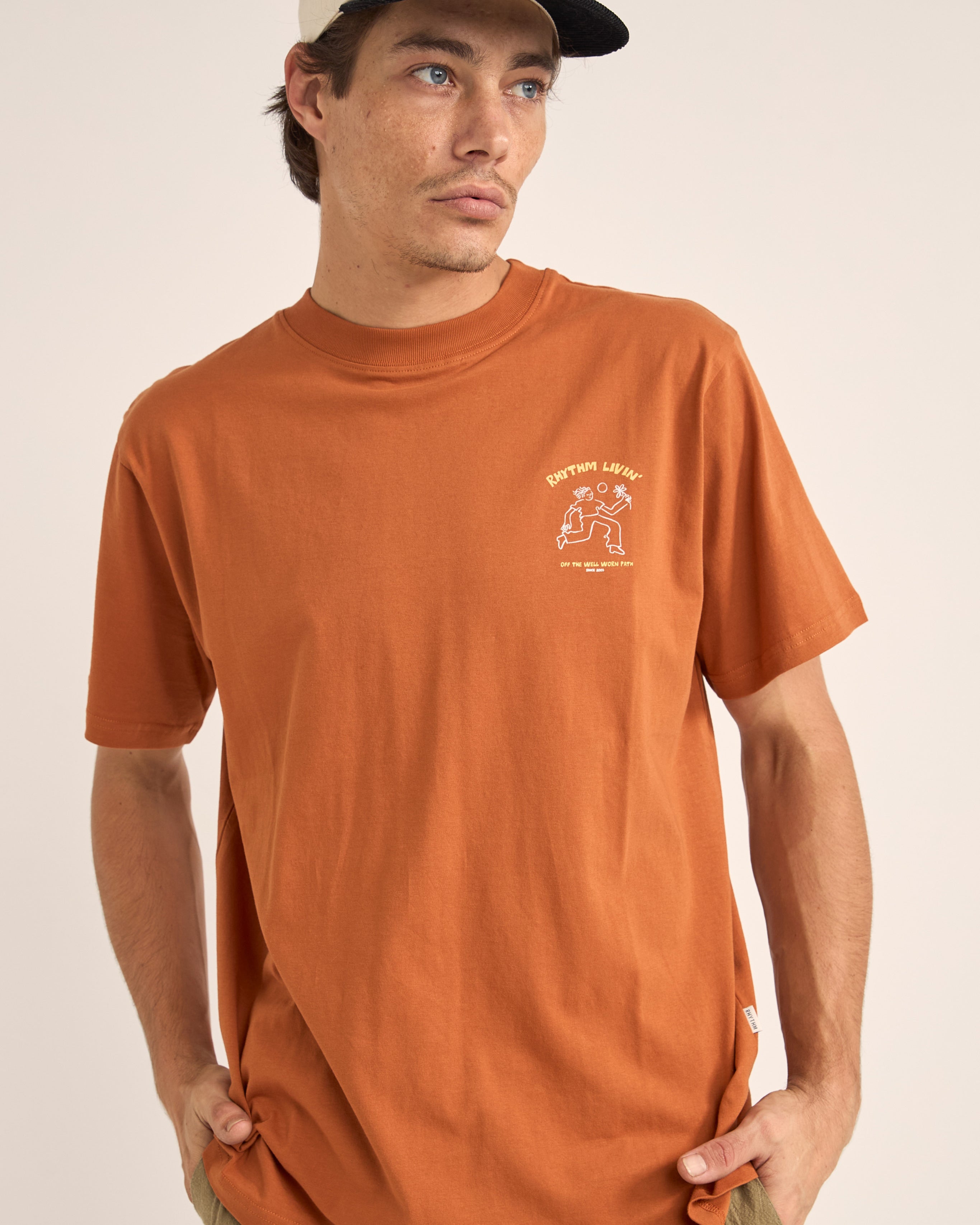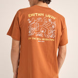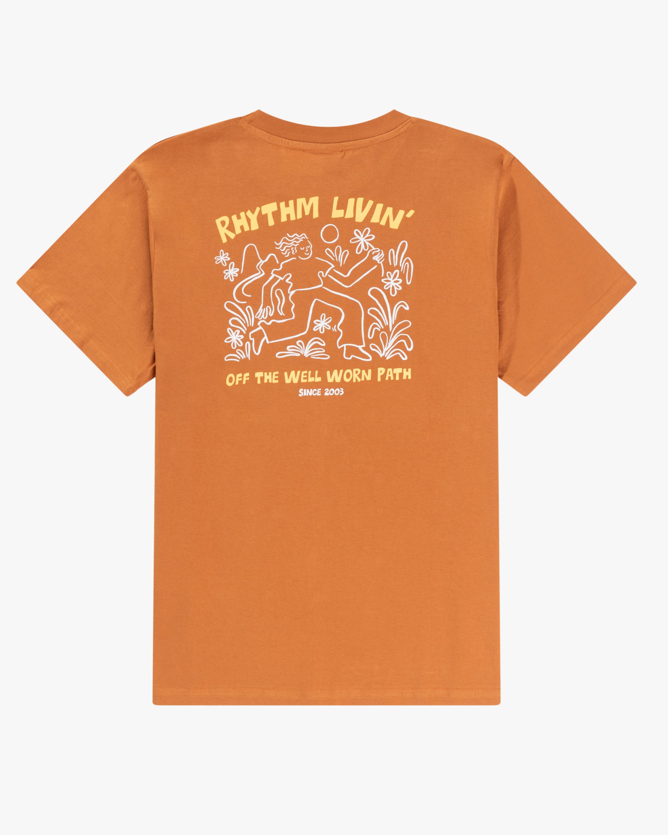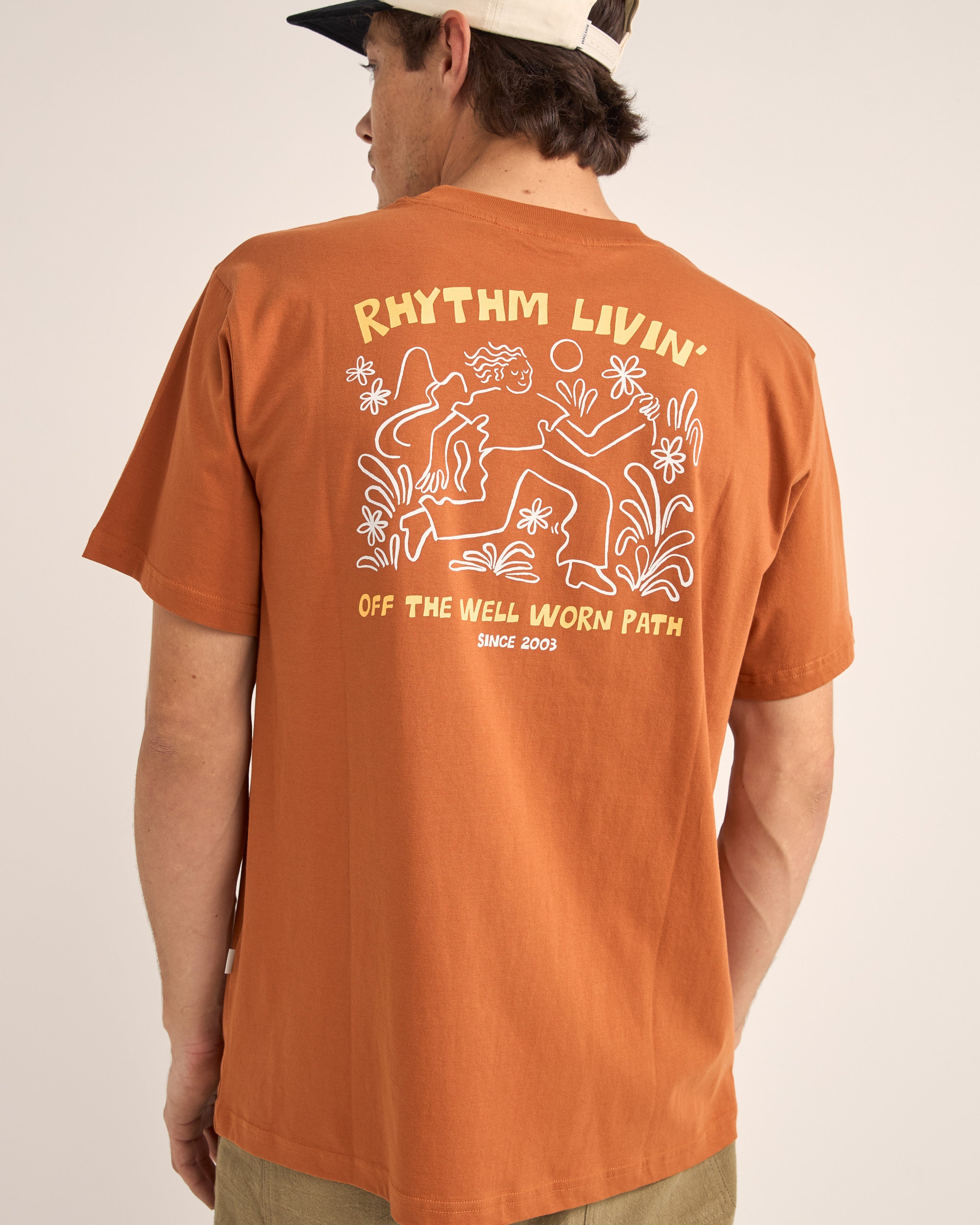 Freedom t-shirt från Rhythm i 100% bomull, pryds med ett tryck vid bröst och större baktill "Off the well worn path", tvättad för en skönare känsla.