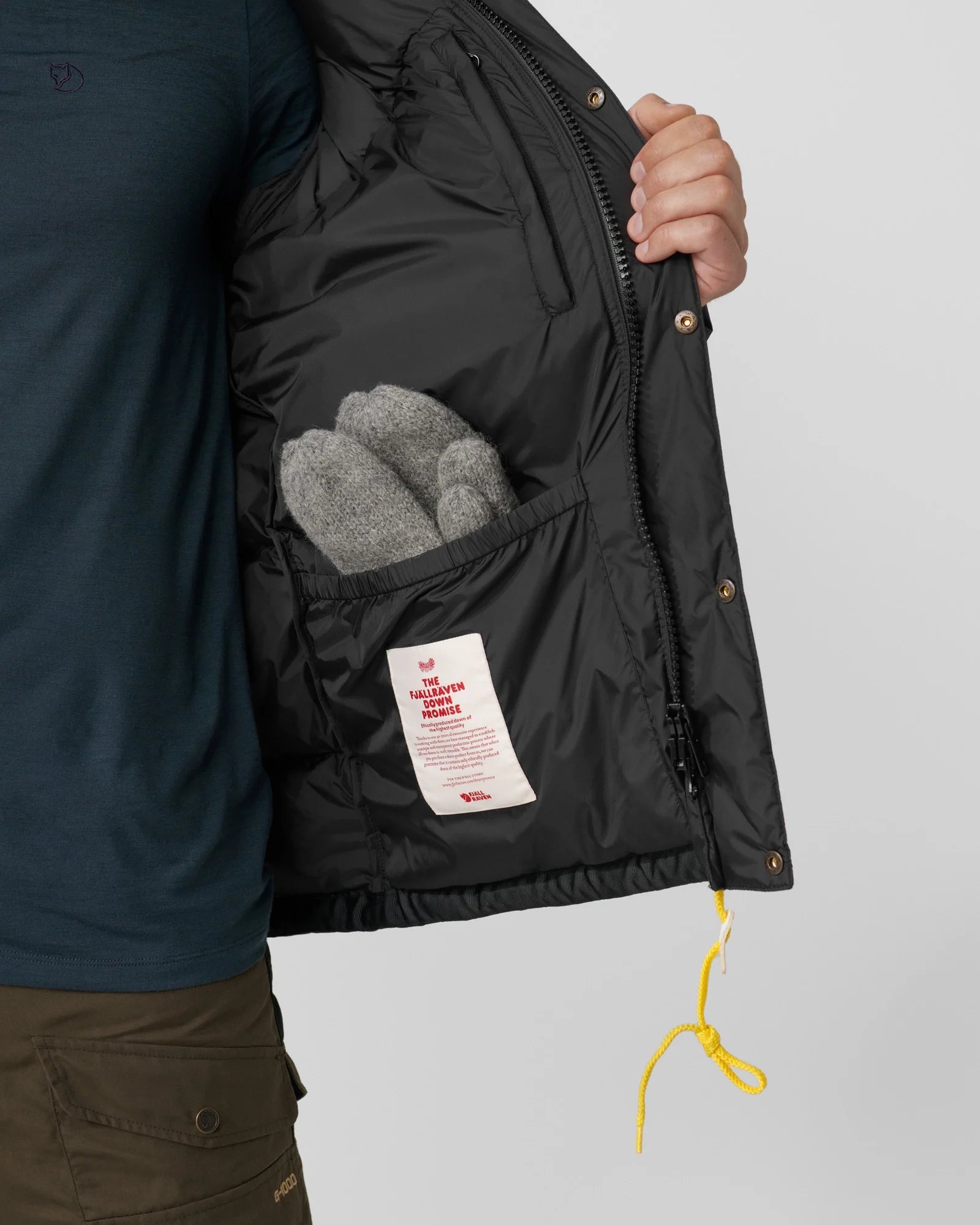- 35% mindre dun för att passa mildare vinterklimat. Detaljerna är annars precis som på originalet: rejäl och justerbar huva, gula justeringssnoddar och rymliga fickor (fickorna har extra öppning från sidan).