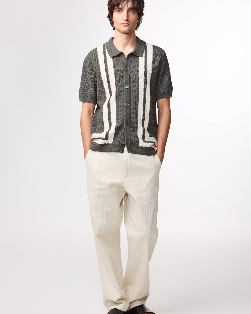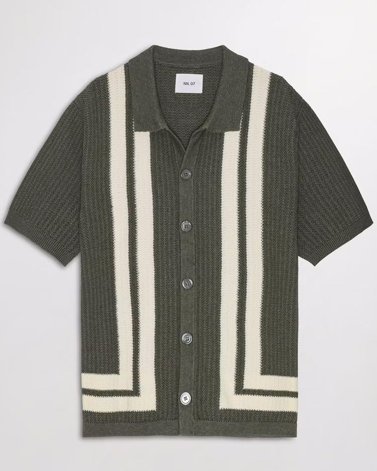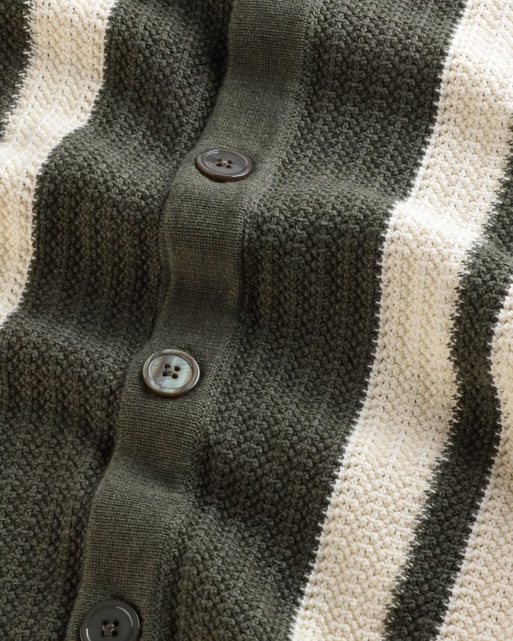 Ares knit från NN07, mjuk ekologisk bomull, stickad i strukturerad söm med randiga detaljer och avslutad med matchande pärlemorknappar.