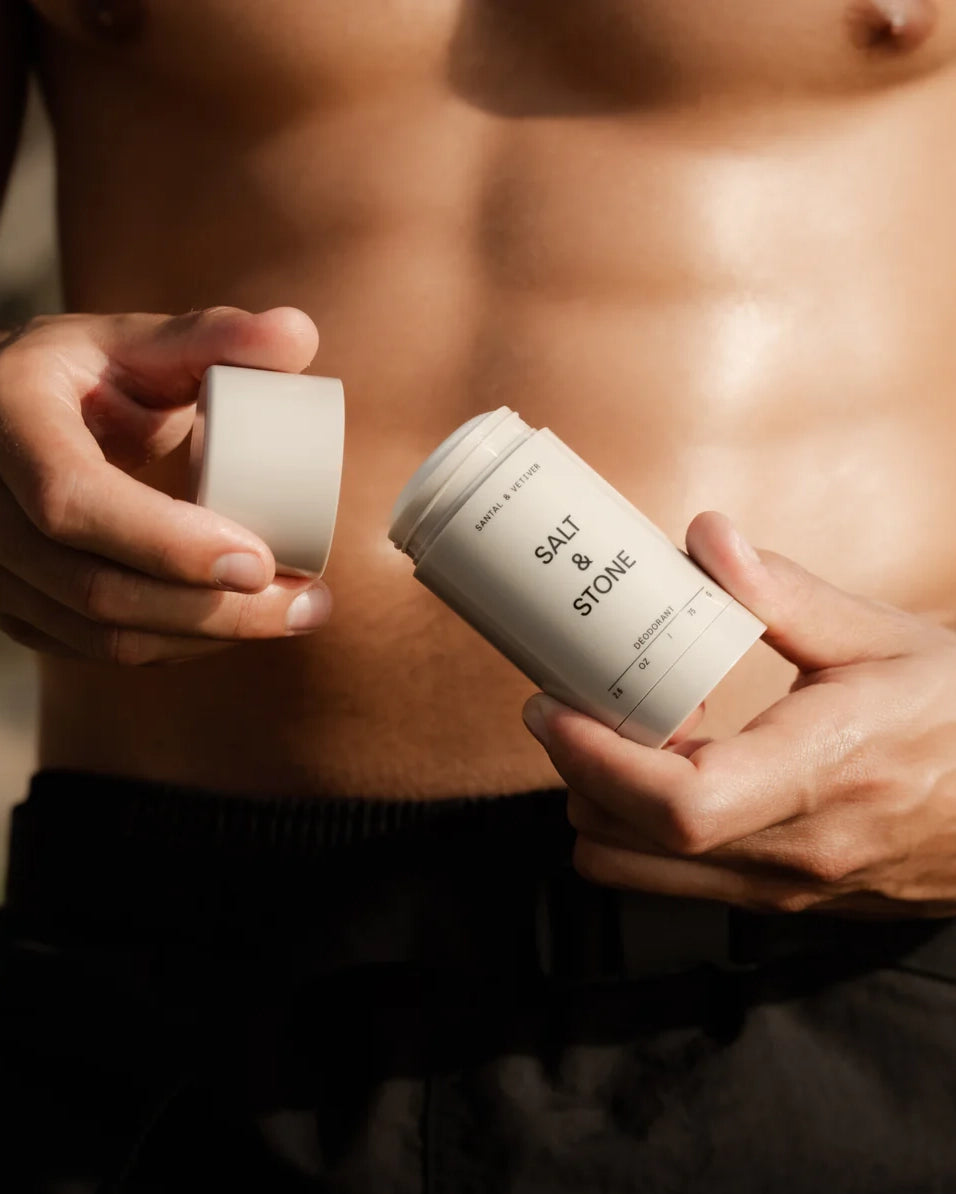 Prisbelönt deodorant från Salt & Stone, för 48 timmars skydd, helt fri från parabener, alkohol och aluminium.