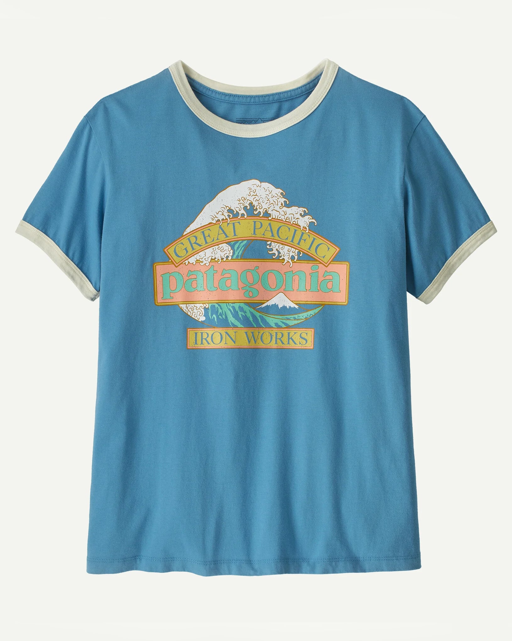 Great Waves Ringer Tee från Patagonia pryds av ikoniska trycken Hokusai’s våg och Patagonia Iron work, tillverkad i 100% organisk bomull och har en retro inspirerad crewneck hals.