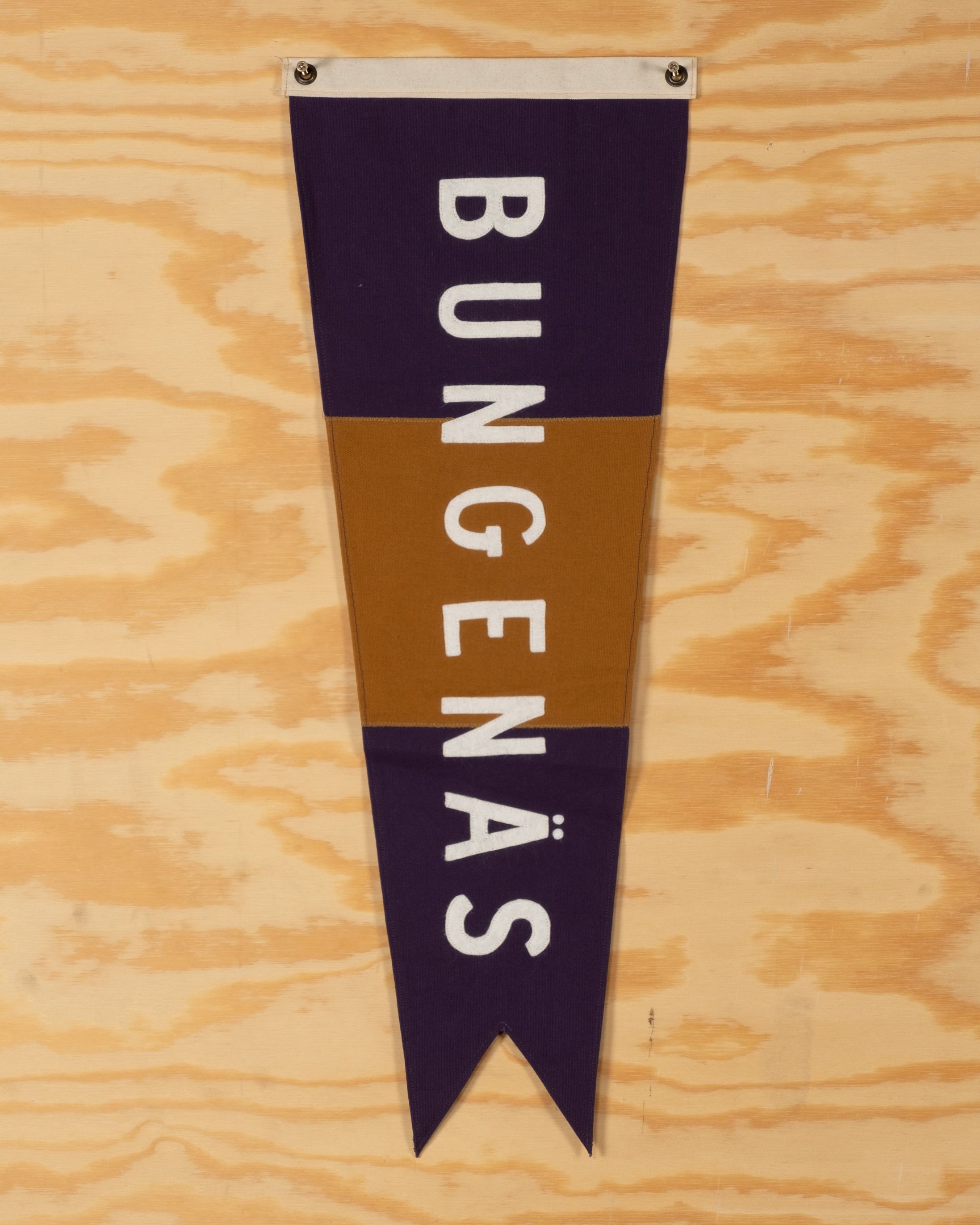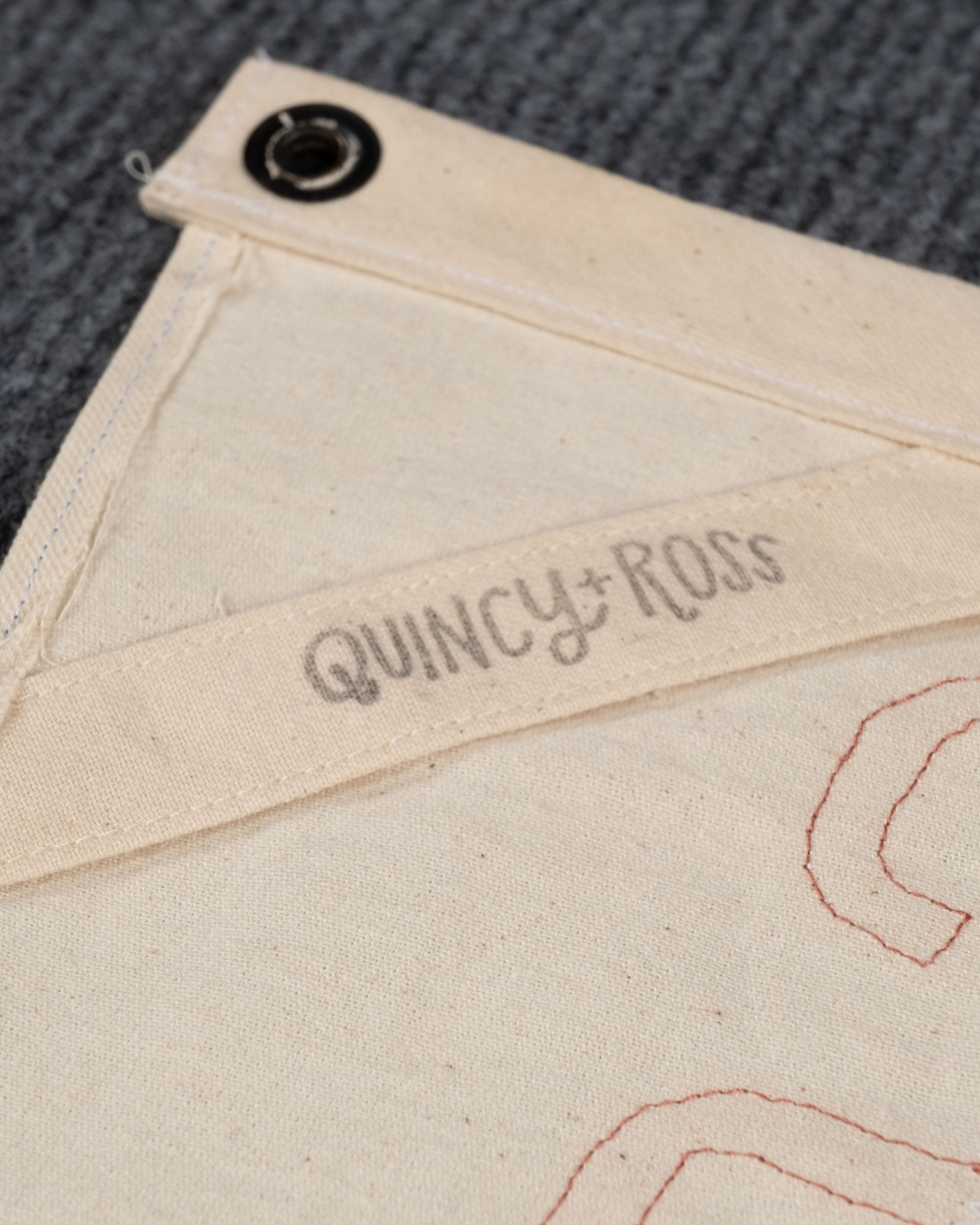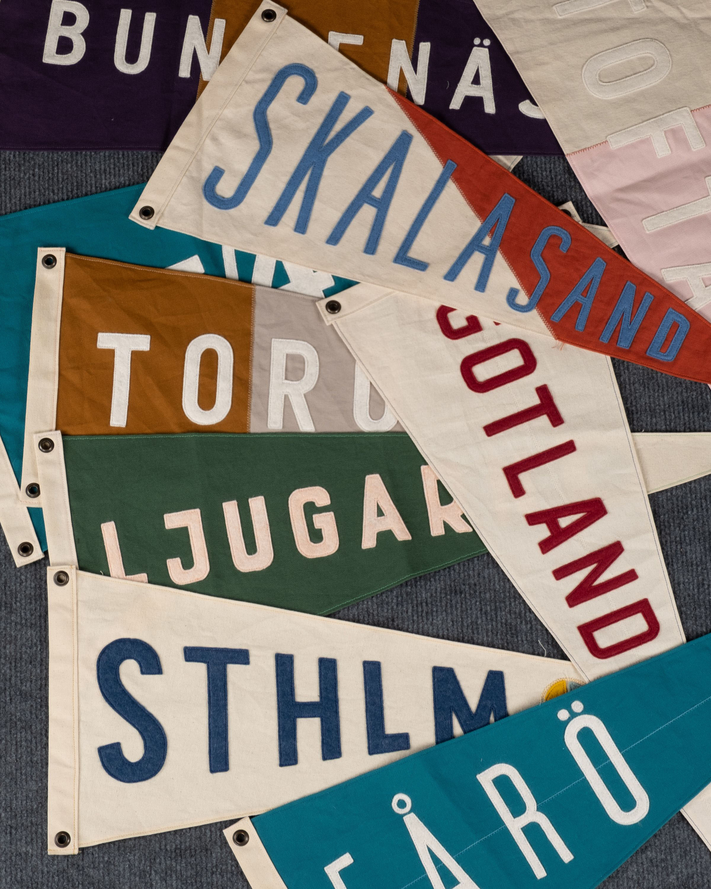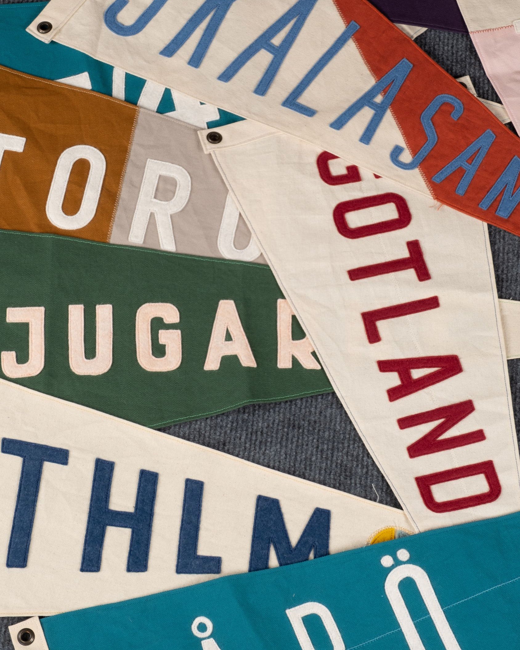 Vår egendesignade handgjorda vimpel som görs tillsammans med Quincy & Ross från Kalifornien.